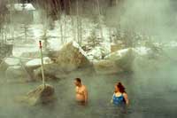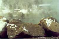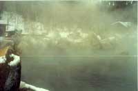 When I first arrived the springs had these amazing clouds of steam hovering over them. The way it was expalined to me was that since Chena Hot Springs is nestled in a valley and shielded from the wind the steam more or less hovers over the springs. By so doing it actually keeps the the air 6 -8 feet above the waterline quite warm. The the way the steam from your show warms your room.