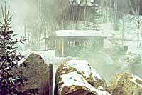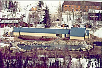 Last winter one of my most exciting projects was when I went down to Chena Hot Springs Resort and did an all day photo shoot of their facilities. This photo was taken from a high hill or low mountain (depending on your point of view) behind the hotel and indoor hot spring fed pool. Directly in front of the blue-roofed indoor pool you can see the resort's main hot spring. This is the one that tourists from all over the world come to enjoy year round.