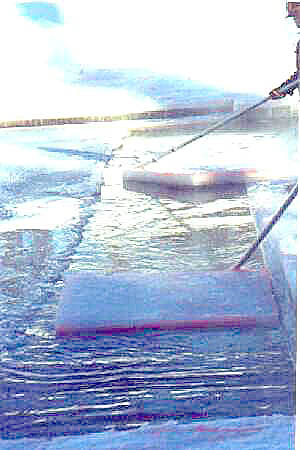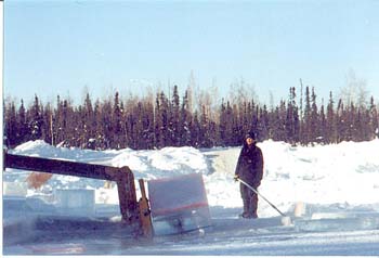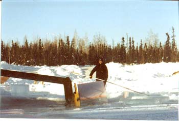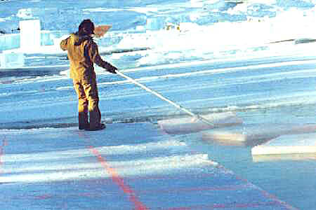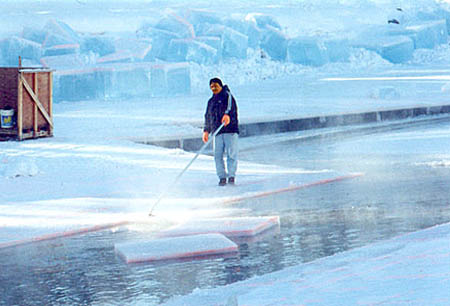 To help facilitate the Icesled operator an elaborate channel system was developed where each cake of ice is floated across the pond to an open pool where awaiting fork lifts scoop them out.