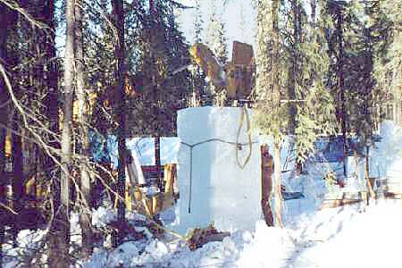 Typically cut in two sizes the smaller blocks used in the Multi-Block Competition dimensions are 4' x 4' x 4' and weigh approximately 3000 pounds apiece, while the larger used in the Single Block Competition, and Alaska Open are 4' x 4' x 6' and weigh in excess of 7500 pounds each. Averaging about 250 blocks per day, during the course of the week of ice harvest, Ice Alaska’s “Gravel Pit” artists carve out about 1500 blocks.