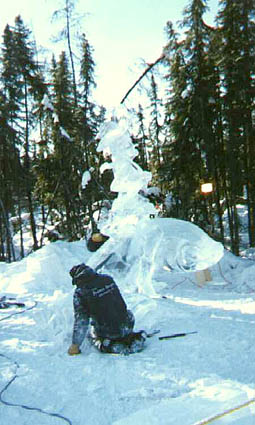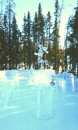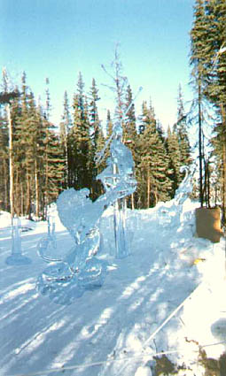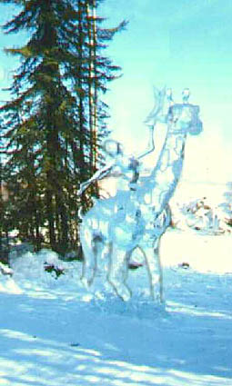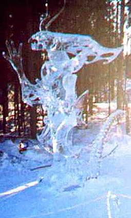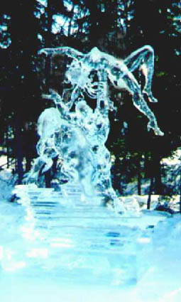 Keep in mind that most of the carvings that you see on this page with exception of the Centaur and Female warrior, are part of the single block ice carving contest. I wish these photo's were a little better, so that you could see the level of detail in these sculptures. For example the giraffe has its spots carved into the ice, and the cowgirl's lasso carved out of ice. They can carve this ice as thing as glass making pages in a book with writing on it, or whittle it down to the diameter of a pencil, If I hadn't seen it myself I wouldn't have ever beleived that any of this was possible with the medium of ice.