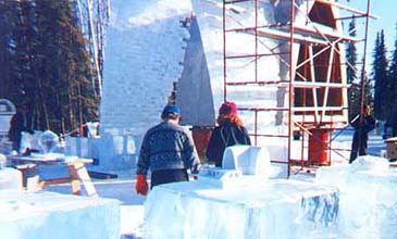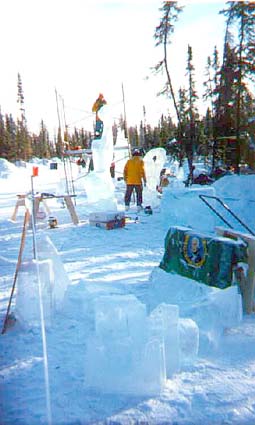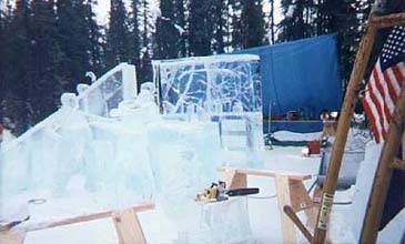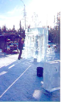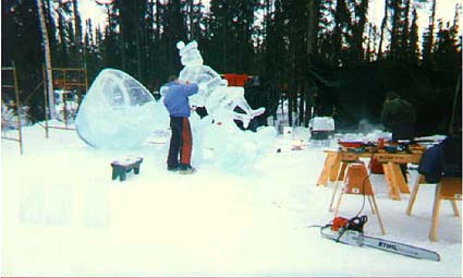 The tools of the trade are also quite interesting in this sport. They consist of homemade wood chisels mounted on broom handles. A small board with dozens of nails hammered in it which is used like a rasp file to roughen the surface between two blocks of ice before being joined with a little water and snow. A chain saw. A small hand hatchet. And the biggie, a heat gun to give the completed ice sculpture a polished finish.