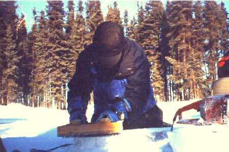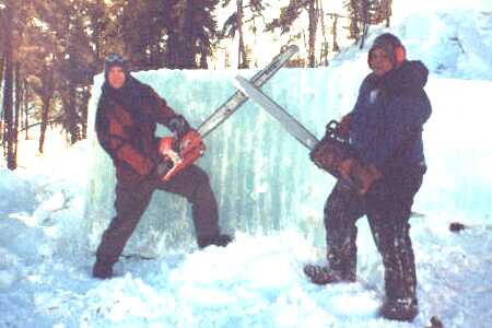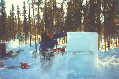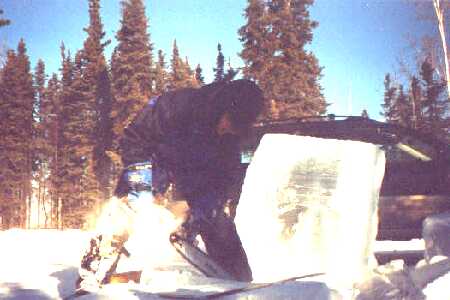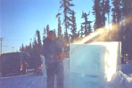 Champion Ice sculpture Carl Eady at hard work cutting dozens of ice slabs from huge block that are later assembled into giant ice slides, mazes, and many other delights.