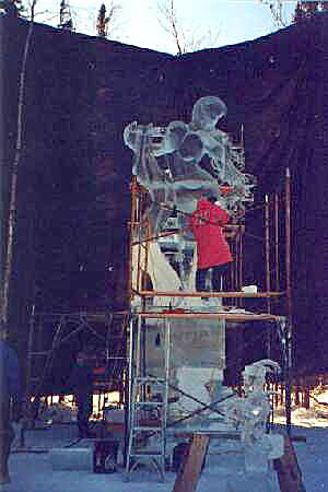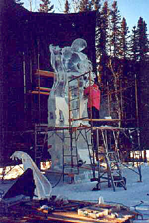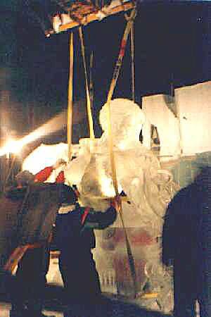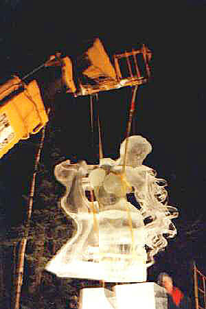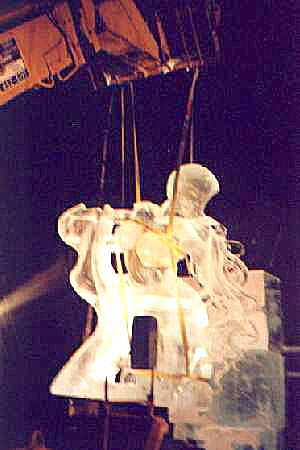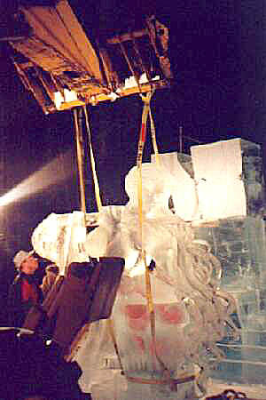 After removing Pandora's arm, the sculpture is then raised few feet in the air. And the bottom of the statue receives some final prep work with a hand made ice scraper, so that once joined to the rest of its body there will be no discernable seam in the ice.